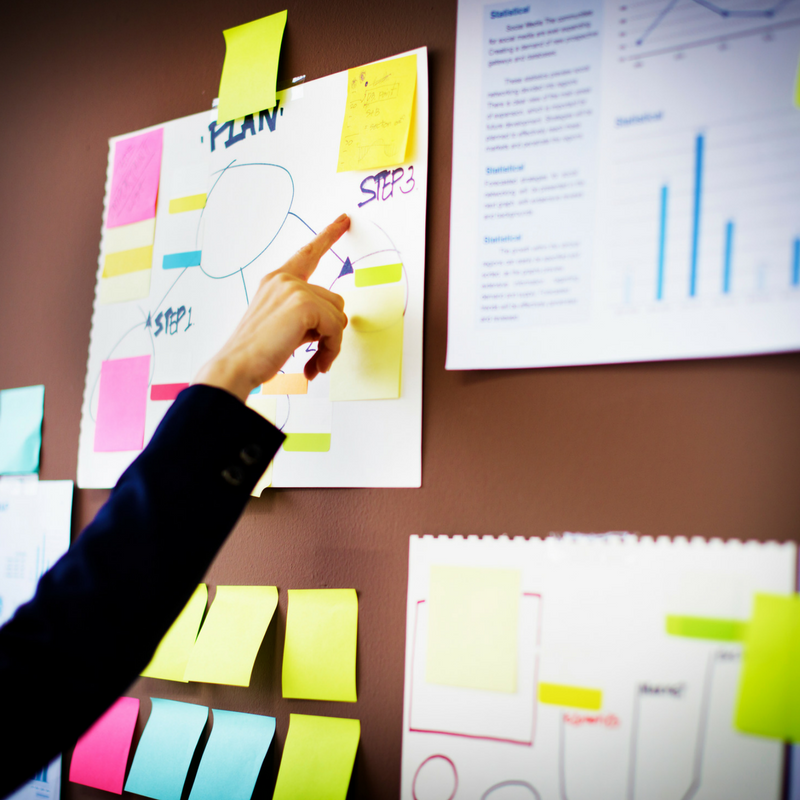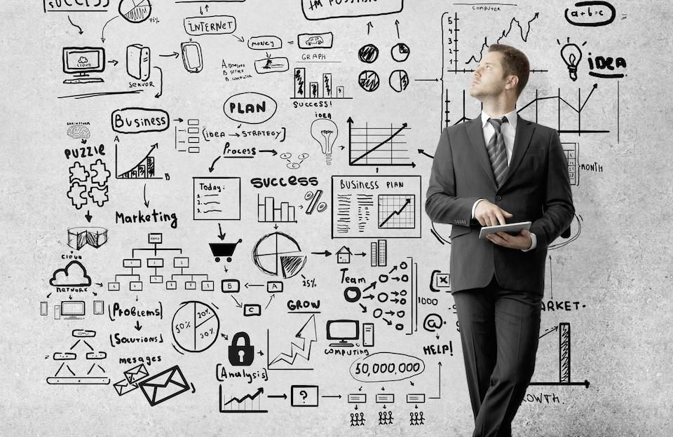 Skizze eines an einer Tafel gezeichneten Businessplans — Strategiekonzepte