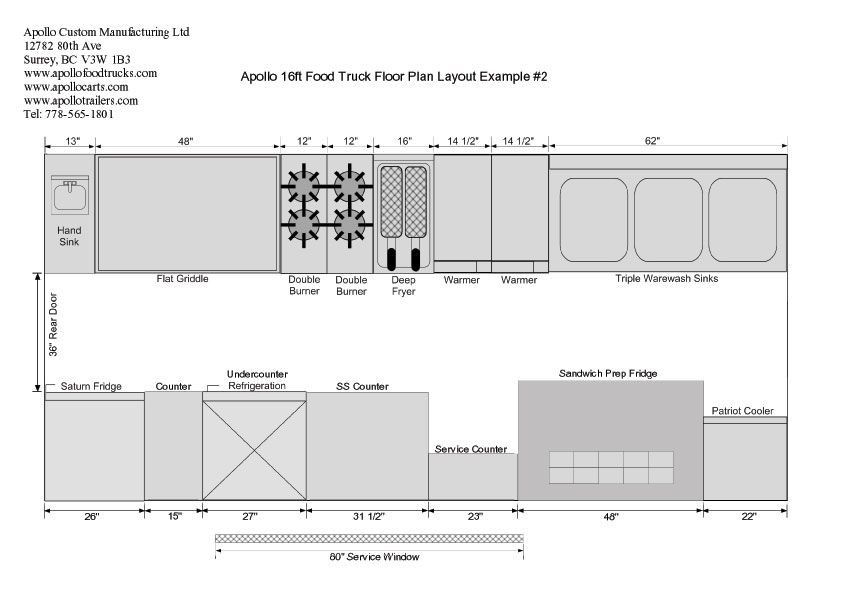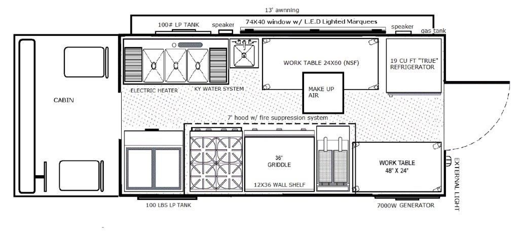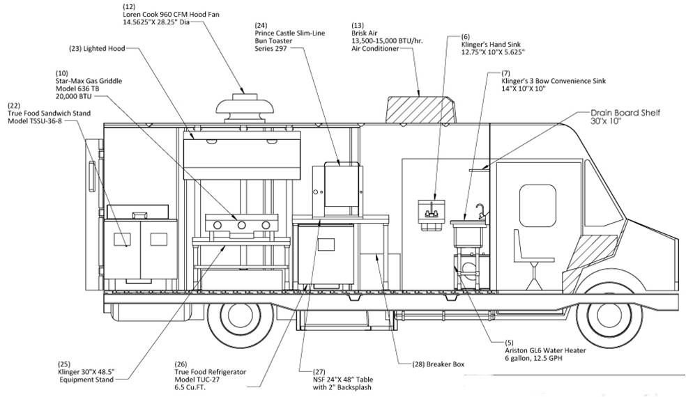 Комплект обладнання розрахований на виробництво і продаж бургерів, сендвічів, ролів, паніні, картоплі-фрі, чаю та свіжозвареної зернової кави. Пропускна здатність — 40-60 осіб на годину.