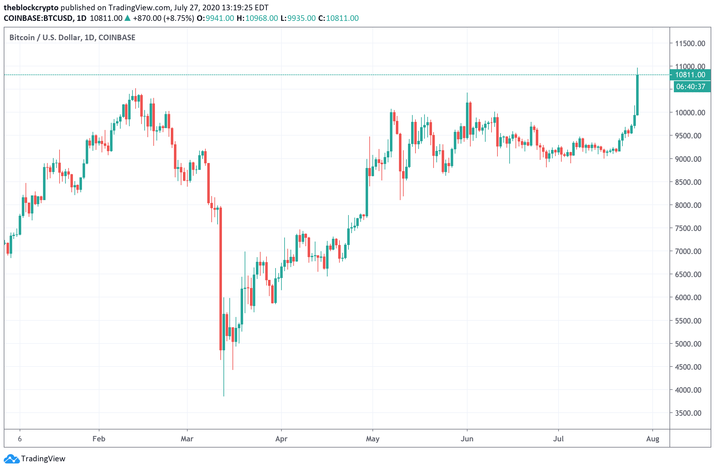В разгар лета, в июле, биткойн открылся выше отметки в 10 000 долларов, достигнув 10 442,80 долларов в первый день месяца. Затем он превысил 11 000 долларов в течение первых двух недель квартала.
