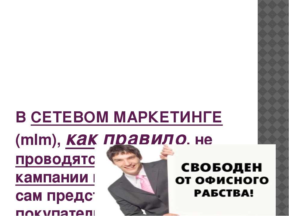Многоуровневый маркетинг, или иными словами сетевой маркетинг – это особая схема продвижения товара на потребительском рынке, которая даёт производителю возможность распространять производимую продукцию среди непосредственных потребителей методом прямых продаж.