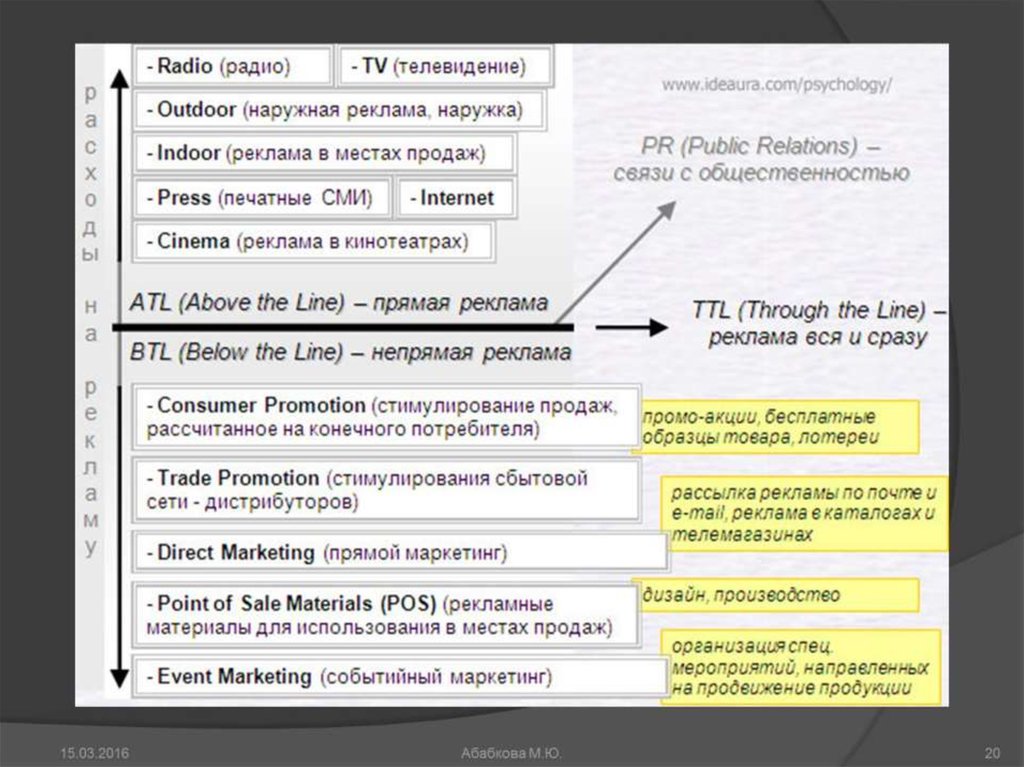 Реклама включает продвижение идеи или продукта на рынке путем размещения рекламы в средствах массовой информации.