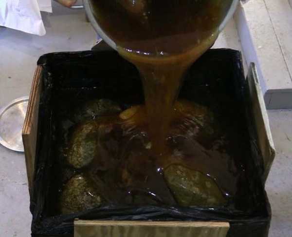 После того, как камни обработаны реактивами, настало время заливки силиконовой смесью ComposiMold. Для расплава ComposiMold используйте пароварку, микроволновую печь или любой контролируемый источник тепла, который не позволит подняться температуре ComposiMold выше 200F. Наливайте ComposiMold шаг за шагом, если не хватает, чтобы покрыть камни за одну заливку. При заливке слоями расплавленный composimold будет таять и сливаться со слоем, который уже налит. Будьте осторожны при обращении с ComposiMold, потому что это будет жарко, следует надевать перчатки.