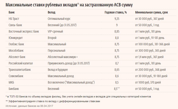 Например, Сбербанк и ВТБ имеют относительно маленькие ставки, но зато в них можно класть большие суммы, не боясь их потерять.