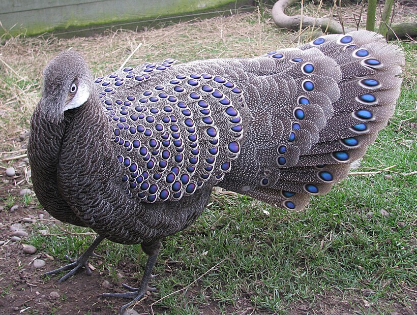 Представитель отдельного рода, великолепный фазан Аргус на первый взгляд может показаться хоть и большим, но не таким привлекательным, как предыдущие яркие виды. У птицы серовато-зеленое крапчатое оперение, шея рыжая, голова – ярко-синяя.