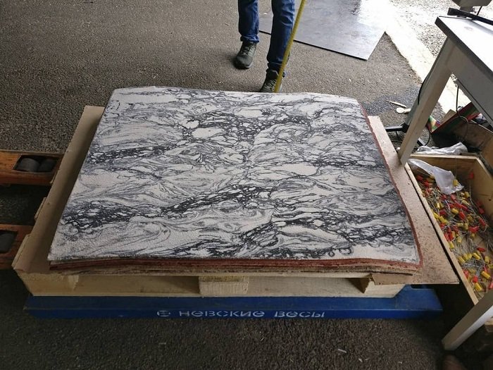 Когда заливка будет сделана наполовину, нужно добавить синтетическую сетку для армирования. Вместо неё в раствор можно залить волокна фибры. После армирования заливка продолжается до заполнения формы. Все время проводится вибрирование для уплотнения массы, так что работы нужно выполнять на вибростоле. На поверхности смеси нужно сделать бороздки – так камень будет лучше приклеиваться.