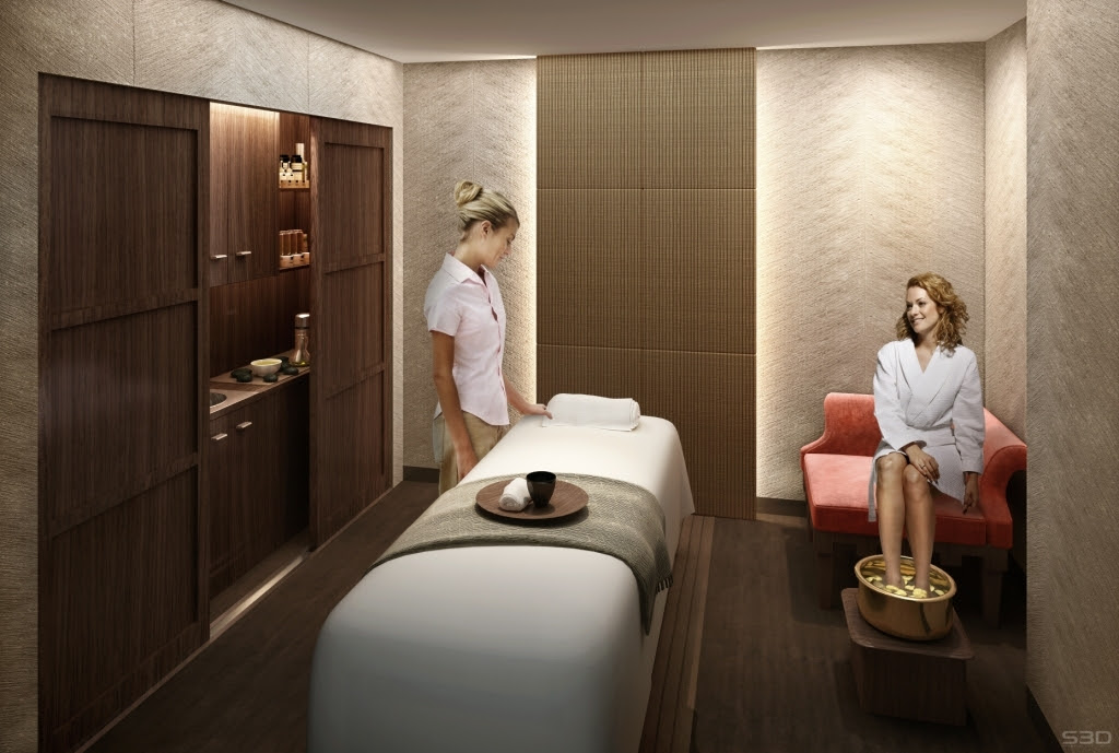 Обычно массажный стол располагается в центре комнаты, создавая тем самым фокус. Специалисты предполагают, что изголовье массажного стола должно находиться как можно дальше от входа в комнату, так как это создает у клиентов чувство защищенности и защищенности.