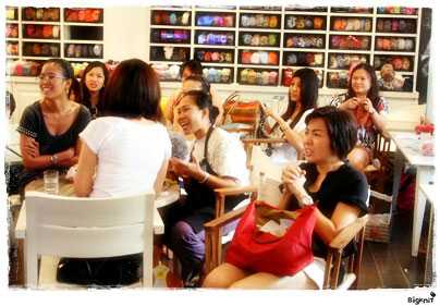 Так вот, в прошлом году открылись еще два рукодельных кафе – в Париже, тоже для любителей шить, и в Бангкоке – для любителей вязать. Парижское кафе «Sweat Shop» во многом аналогично берлинскому Linkle: почасовая оплата или дневной абонемент, консультации специалистов, семинары по разным видам рукоделия, чай, кофе… Правда, в отличие от «Linkle» здесь можно не только шить, но и вышивать, и вязать. А только вязать можно в бангкокском «BigKnitCafe», открытом Хуном Найсом пару лет назад и уже благодаря интернету известном во всем мире. В вязальное кафе можно прийти даже если совсем не умеешь вязать: достаточно купить комплект пряжи прямо там, в кафе, и персонал преподаст первый урок. Ассортимент пряжи и сопутствующих инструментов ничуть не уступает ассортименту хорошего специализированного магазина, а полноценное меню привлекает местных гурманов и сладкоежек. Говорят, сюда заглядывают и местные знаменитости – всякие бангкокские певцы, актеры, модели, ведущие.