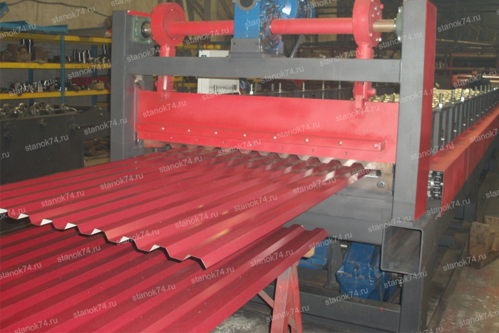 Гильотина для профилированного металла. Это устройство представляет собой электромеханические ножницы которые предназначены для замера и отрезания каждого профлиста. Как особенность устройства выделяют то, что нож по профилю должен соответствовать форме гофры иначе могут быть повреждения. Монтируют гильотину в конце прокатного стола.