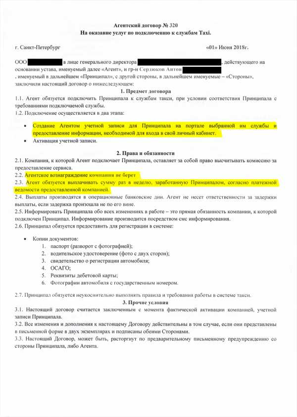 Агентский договор на подключение к агрегатору. Таксопарк бесплатно создает водителю учетную запись в системе «Яндекс-такси» и обязуется раз в неделю выплачивать ему заработанные деньгиУсловия работы