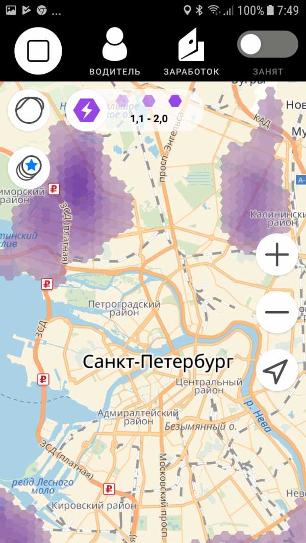 Большую часть времени заказы поступали ко мне бесперебойно, но были и периоды затишья. Если клиентов нет, то лучше рвануть туда, где не хватает машин. На карте в приложении такие районы выделены цветом: чем темнее зона, тем нужнее там такси. В самый темный — фиолетовый — цвет окрашена зона повышенного спроса. Здесь машин не хватает и действуют двойные тарифы — заработать можно больше.
