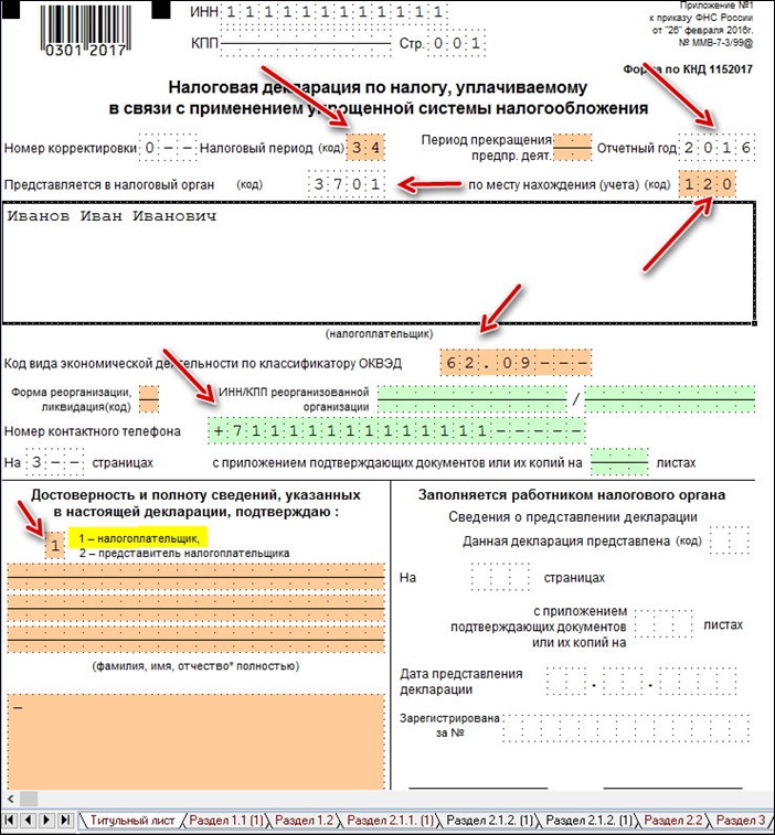 Вам, как ИП на УСН, требуется заполнить в отчетной форме титульный лист и разделы 1.1 и 2.1.1 Но порядок заполнения иной: сперва титул, потом конец, а лишь затем раздел 1.1 .