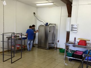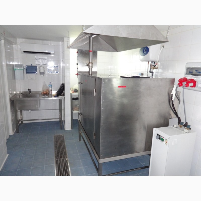 Мобильный контейнер длина 6.2м ширина 2.46м высота 2.5м. в нем имеется, электрическая коптильная камера (объем 600литров) 8Квт, электрическая камера для сушки 5Квт, 2 тележки для копчения и сушки продукта, водонагреватель, обогреватель воздуха, 2 разделочных стола, мойка, подвод отвод воды, утепление стен, пола и крыши 100мм мин вата.