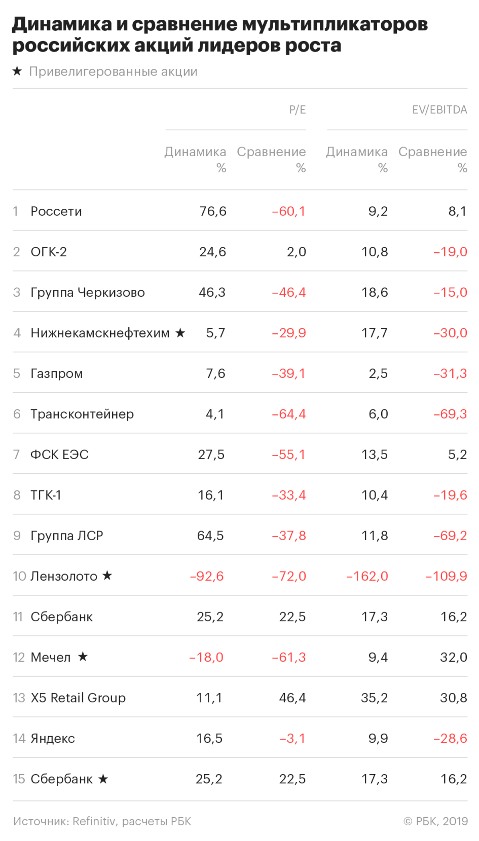 Среди российских лидеров роста по значению мультипликаторов можно говорить о переоцененности обоих видов акций Сбербанка и депозитарных расписок X5 Retail Group.