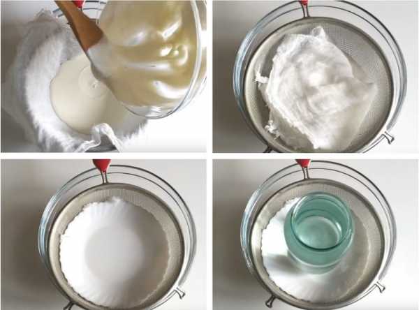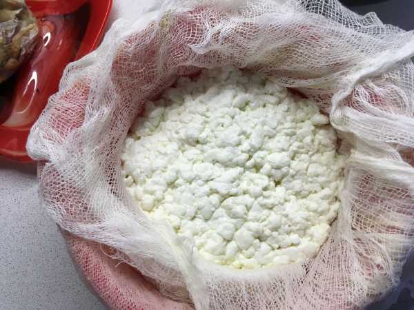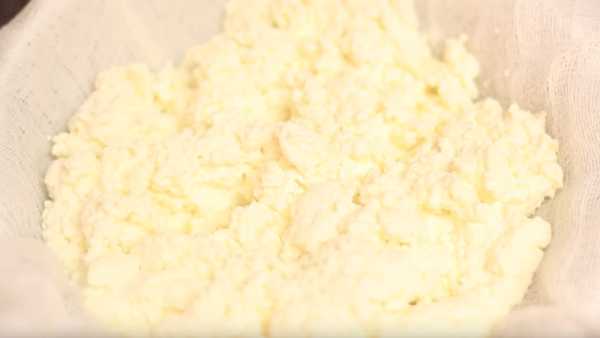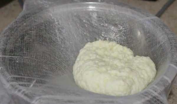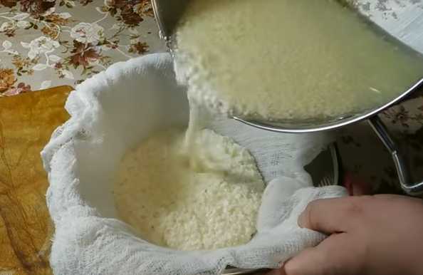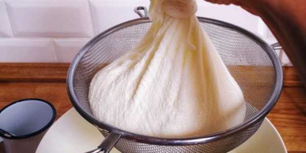 - Откинуть молочную смесь на дуршлаг. Приподнять вместе с марлей, хорошо отжать.