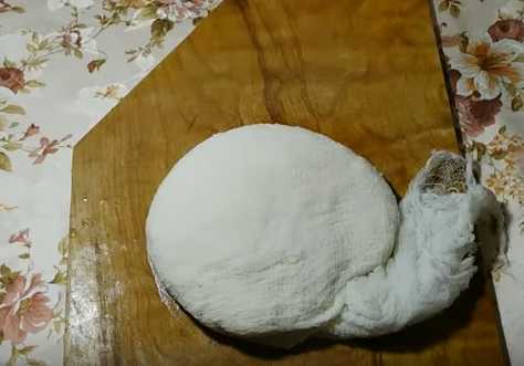 - Через 7 минут достать массу, всплывшую и отделившуюся от сыворотки. Выжать через марлю. Посолить.