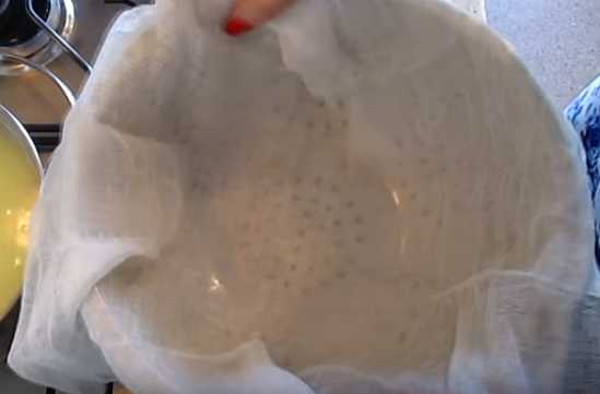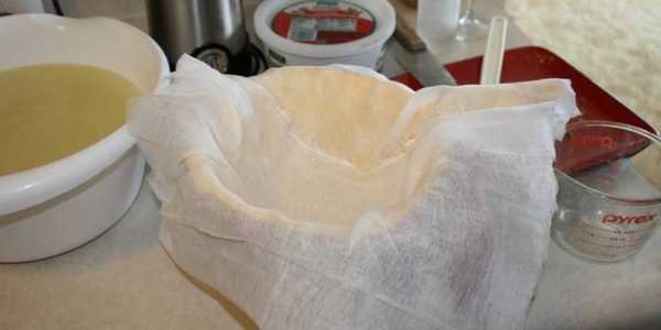 - Откинуть горячую массу на сложенную вчетверо марлю, оставить стекать на 15 минут.