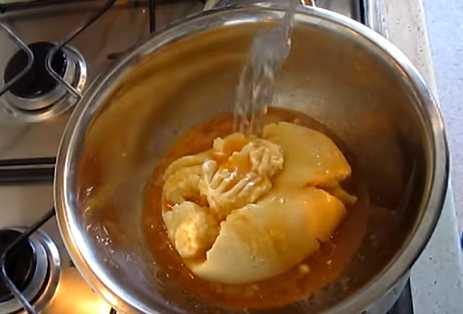 Еще один легкий и доступный по продуктам вариант. Заранее подготовьте кастрюлю, желательно с антипригарным покрытием. А также дуршлаг и чистую марлю. Если нет марли, то подойдет простая не плотная материя. Нужен также подходящий груз, например литровая банка с водой. И можно начинать готовить.