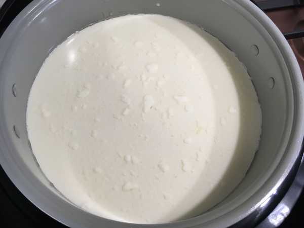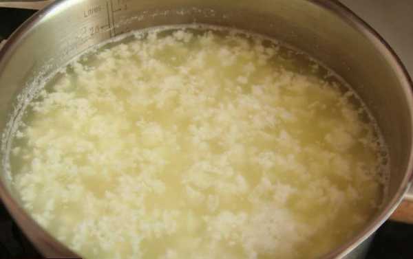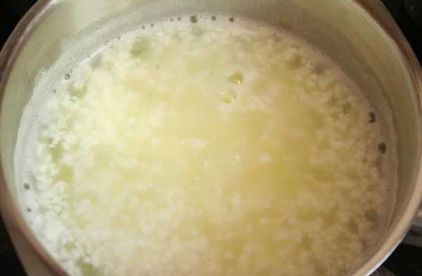 - Нагреть кефир на медленном огне, пока не начнет отделяться сыворотка.