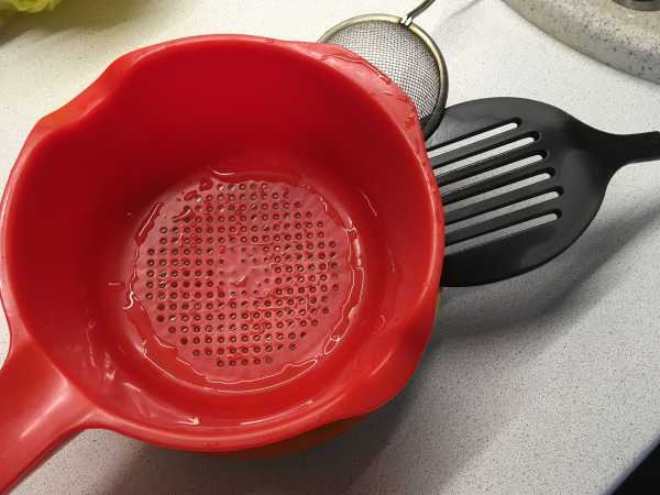 - На дуршлаг положить чистую влажную марлю, сложенную вчетверо.