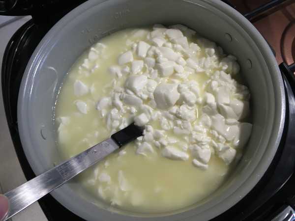 1. Налейте в кастрюлю молоко и опустите в него измельченный творог. Поставьте на средний огонь, размешайте и доведите до кипения. Постоянно помешивая, варите 15 минут.
