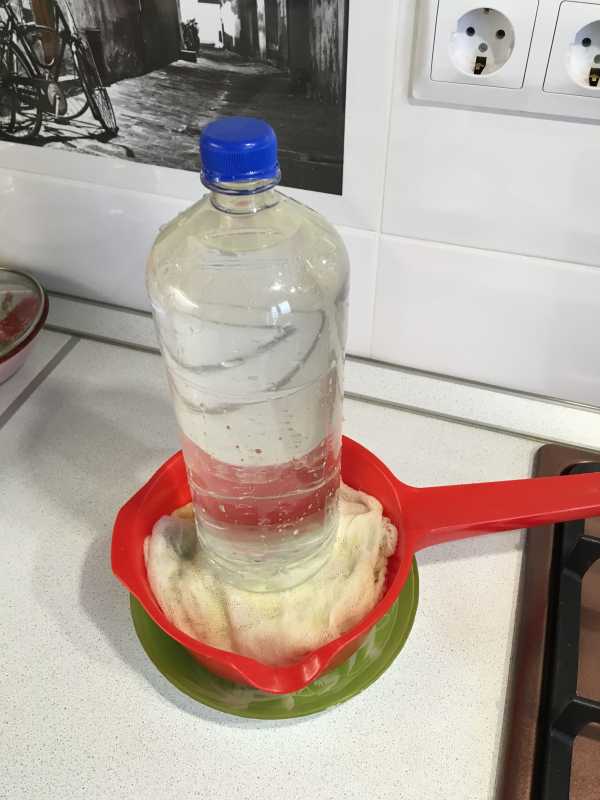 - Завязать уголки марли, подвесить получившийся мешочек над емкостью. Самый простой способ – взять кастрюлю, положить сверху длинную деревянную ложку, подвязать к ней марлю.