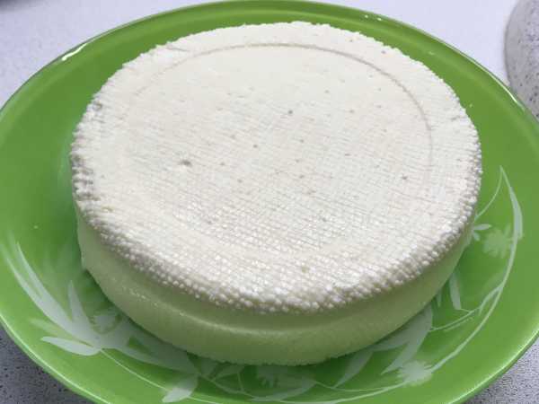 6. Через час вся оставшаяся жидкость стекла. Убирайте пресс, снимите марлю и вас на руках будет очень вкусный готовый продукт, который можно сразу же нарезать на кусочки и употреблять в пищу. Он получается очень упругим и чем-то по-вкусу напоминает «адыгейский».