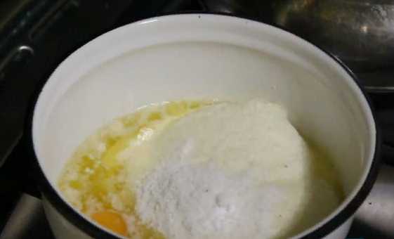 3. Далее в кастрюлю положите сливочное масло и растопите его на огне, затем переложите туда подготовленный творог. Вбейте туда яйца и добавьте соль и соду. Все как следует перемешайте ложкой или лопаткой до однородной массы. Масса получится очень густой.