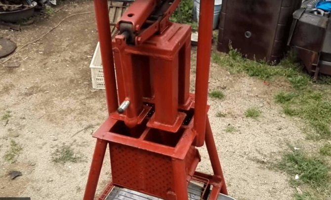 Подобное приспособление, только усовершенствованное, позволяет работать быстрее. От первого варианта его отличает рычаг, выталкивающий брикеты из формы. Можно сделать сдвоенную ёмкость, чтобы за одну закладку изготавливать 2 брикета. Для сборки ручного станка на 2 формы придётся задействовать сварочный аппарат.