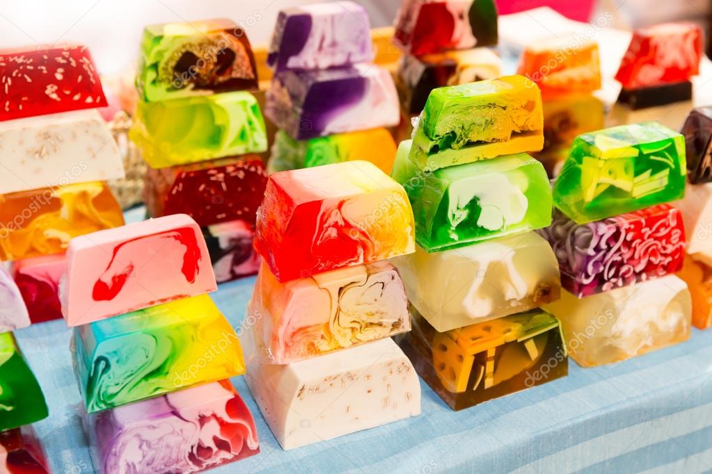 Немного иначе выглядит дело с мылом ручной работы. Очень впечатляют покупателей специальные магазинчики с огромным ассортиментом душистого и красивого мыла. Как правило оно представлено в больших кусках, от которого продавец отрезает стандартные брусочки. Выглядит это действительно прекрасно. От аромата отдушек захватывает дыхание, а от обилия красоты форм и цветов разбегаются глаза.