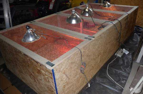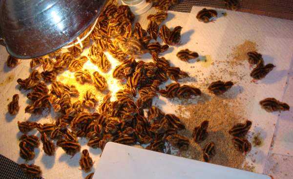 Вырастить перепелов в домашних условиях с первых дней можно в специальном фанерном или картонном ящике-брудере. Его размеры зависят от количества птенцов, исходят из параметров, что на площади дна 30×30 см помещается 100 перепелят. Ящики застилаются либо бумагой, либо мелкой сеточкой 5×10 мм с поддоном внизу. Ящик обязательно должен иметь обогрев и свет.