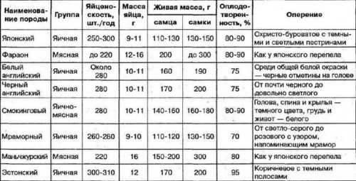 На сегодняшний день в мире известно много разновидностей перепелов. Но немногие из них используются в хозяйстве. Так, например, в общей регистрационной книге указано шесть основных пород перепелов: английская белая и черная, маньчжурская, фараон, австралийская желто-коричневая, смокинговая, а также около 60 породных линий. Большая часть из них выращивается для получения яиц и лишь немногие исключительно для мяса, например, фараон.