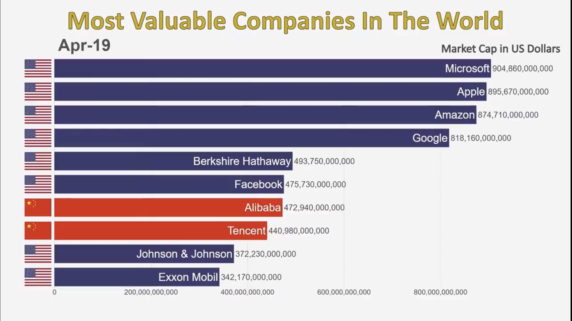 Что касается Китая, который является вторым по количеству компаний в рейтинге, то в этом году одна китайская компания была исключена из рейтинга, это увеличило разрыв между Китаем и США. Рыночная капитализация Alibaba оценивается в $522 миллиарда.