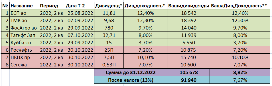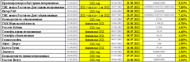 При расчете средневзвешенной доходности более поздним выплатам придавался больший вес. Так, для выплат 2022 года вес равен 5, далее для 2021 года — 4, 2020-го — 3, 2019-го — 2, 2018-го — 1.