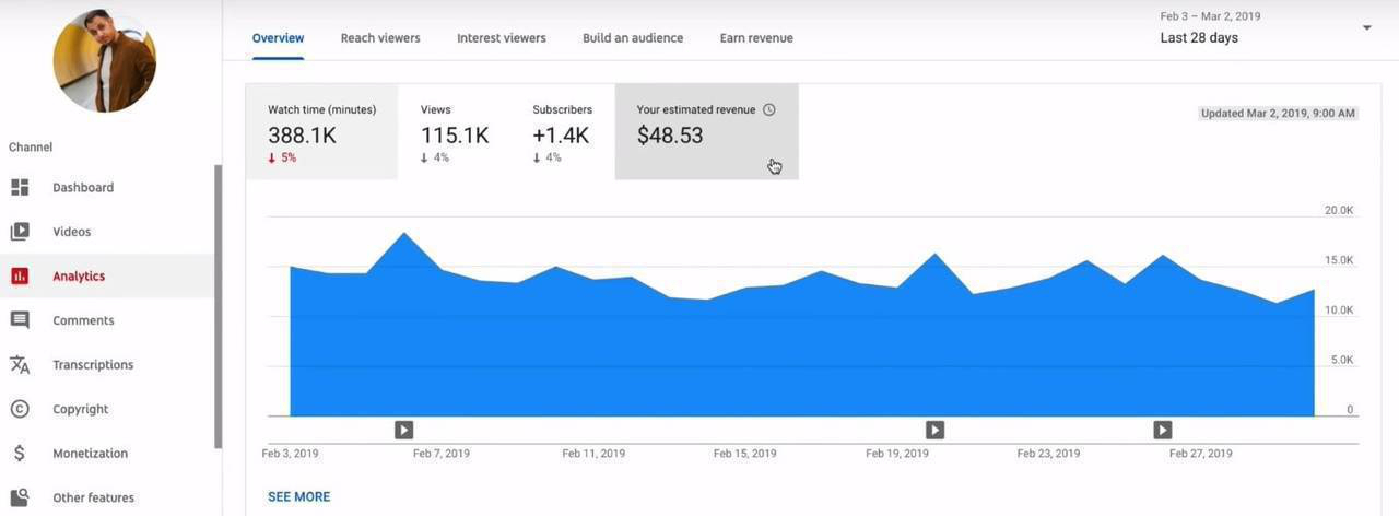 Учитывая все это при расчете, ютубер мог бы заработать ( 15% от 1k) x 20 долларов ≅ 3 доллара за 1000 просмотров.