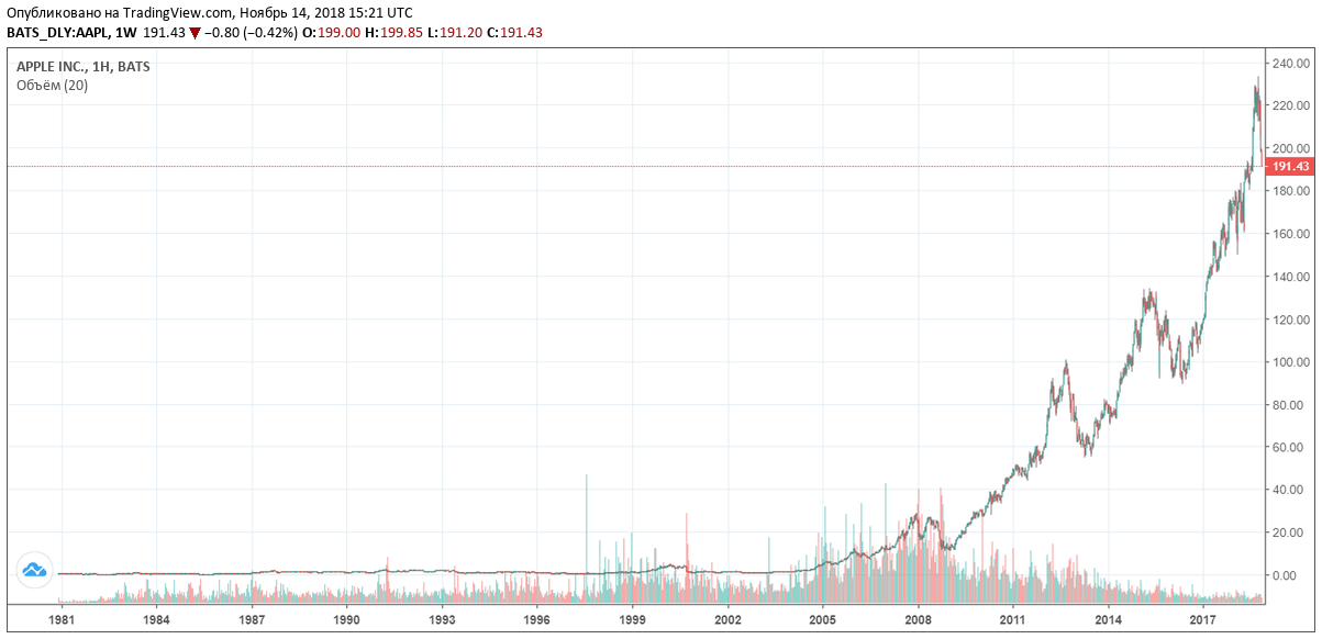 В 80-х AAPL в моменте стоила по 20 центов, а уже в 2018-м она пробила планку в $200 за акцию. Рост более, чем в 1000 раз почти за 40 лет истории котировок. Очень привлекательный вариант для инвесторов, но и трейдеры не останутся в стороне, ведь по AAPL проходят огромные объёмы и есть отличная волатильность.