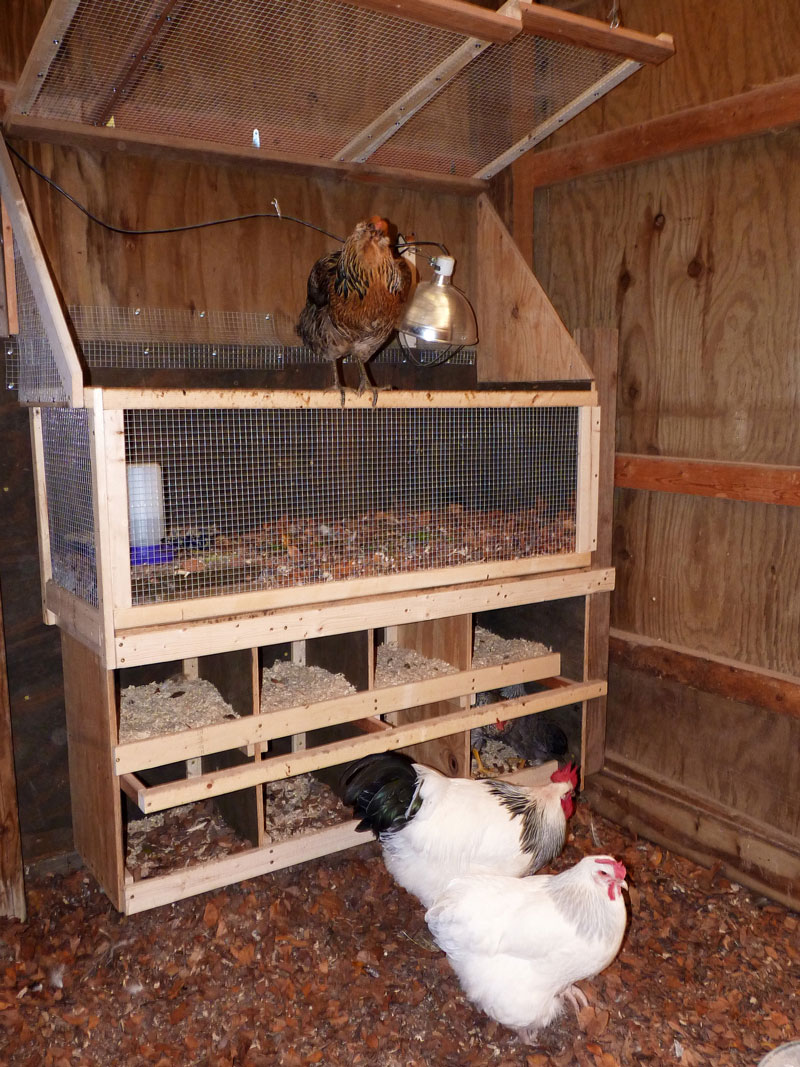 Тем не менее. Вот что я делаю: я вешаю 60-ваттную лампочку над основным насестом, прикрепленную к таймеру, который я установил так, чтобы у цыплят был 14-часовой рабочий день. Свет не дает моим курицам полностью линять. В особенно холодную погоду (когда температура подростка, ниже нуля) я ставлю тепловую лампу, и это очень радует моих цыплят.