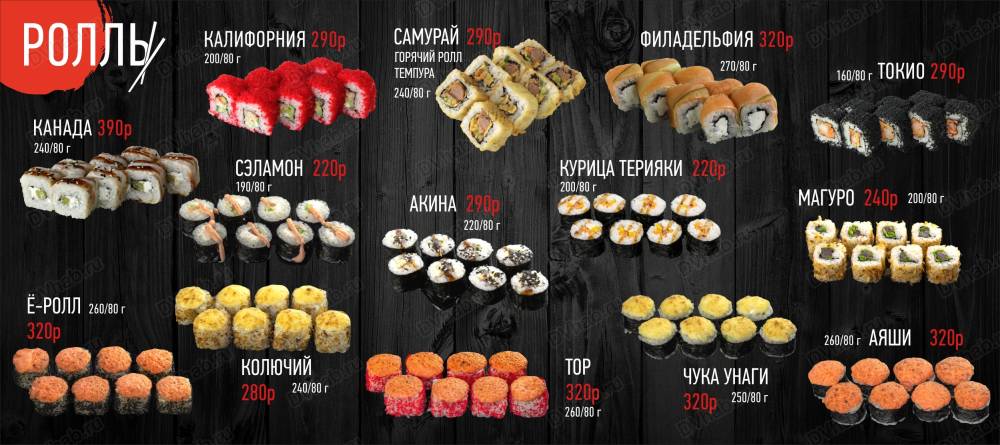 Гигантские булочки размером с буррито украшены нори (морскими водорослями), обернутыми вокруг классических и нестандартных ингредиентов в виде собственных или заранее разработанных комбинаций. Ультрапопулярный лосось Slammin, например, состоит из слегка обжаренного суши-лосося с острым соусом кочуджанг и хрустящими сырыми овощами. Цыпленок катсу — еще один бестселлер: это полоски жареной курицы в центре ролла.