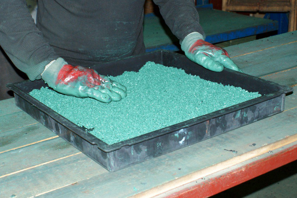 - После подготовки исходного материала, его подают в аппарат для плавки, куда же в дальнейшем подаются такие компоненты как песок, предварительно увлажненный, равно как и краситель.