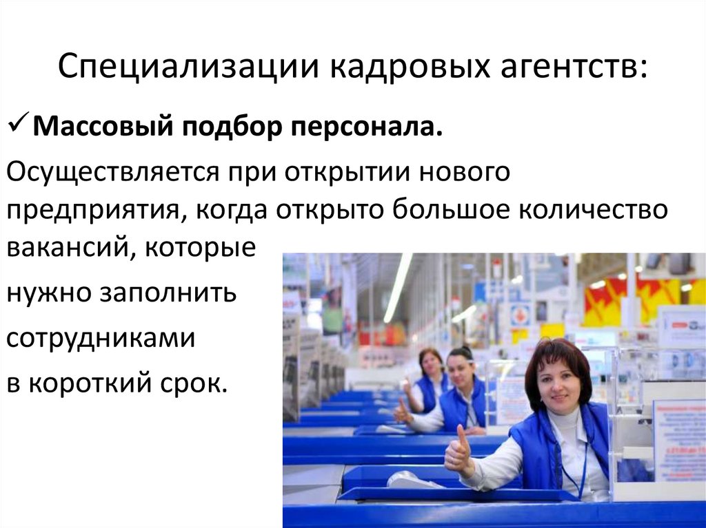 Существуют профильные кадровые агентства, которые подбирают персонал в определенной узкой специализации, т.е. специалистов в определенной сфере.
